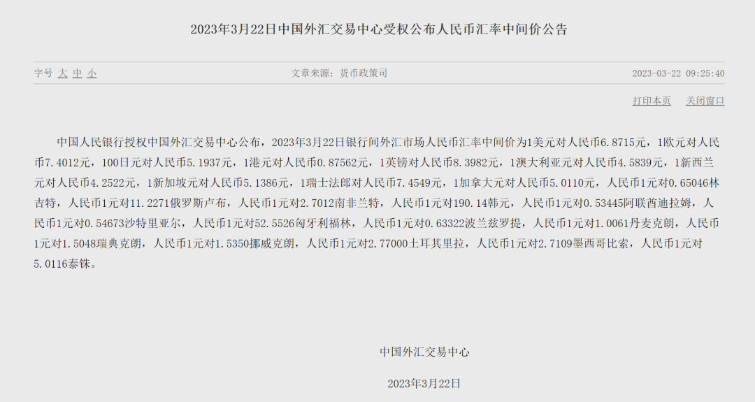 人民币汇率中间价是即期银行间外汇交易市场和银行挂牌汇价的最重要参考指标。中国人民银行于每个工作日闭市后公布当日银行间外汇市场美元等交易货币对人民币的收盘价,作为下一个工作日该货币对人民币交易的中间价。下图为2023年3月22日的人民币汇率中间价。